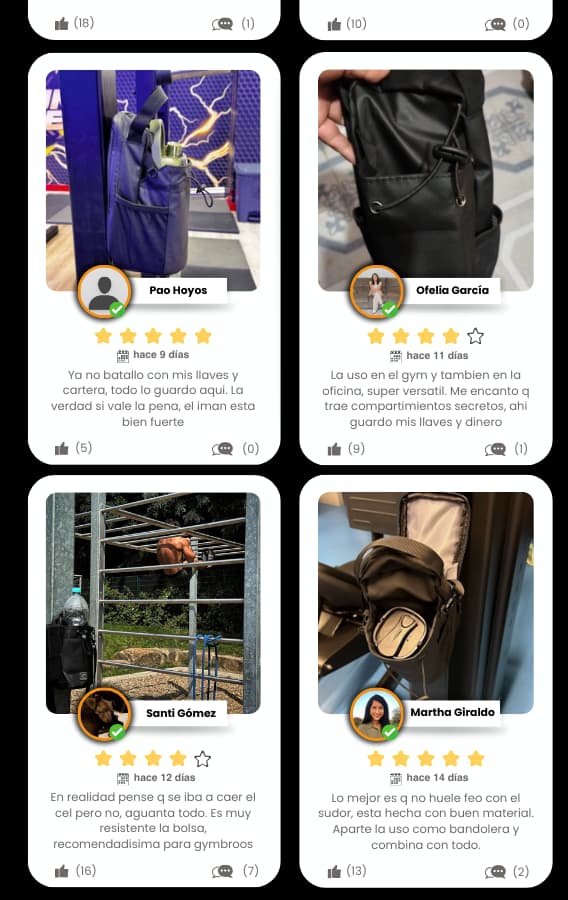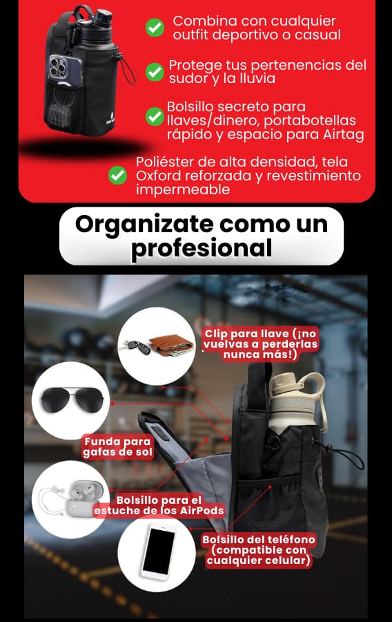 Su tamaño compacto permite guardar lo esencial: botella de hasta 1,5 L, smartphone grande, cartera, llaves, toalla pequeña y accesorios de fitness. Además, incluye compartimentos secretos y organizadores internos.
