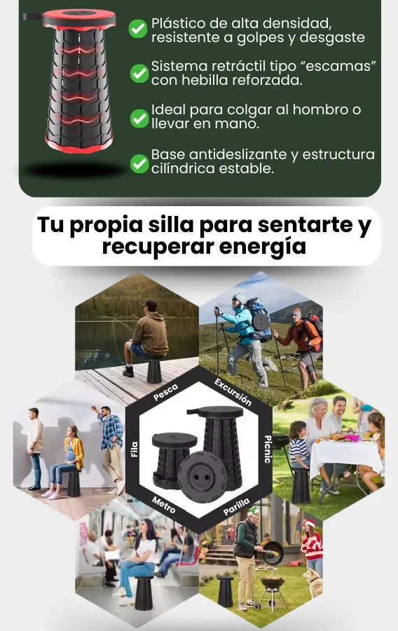 Sí. El diseño incluye base antideslizante, lo que lo hace ideal para superficies como arena, pasto o tierra. Perfecto para camping, pesca, playa o caminatas.